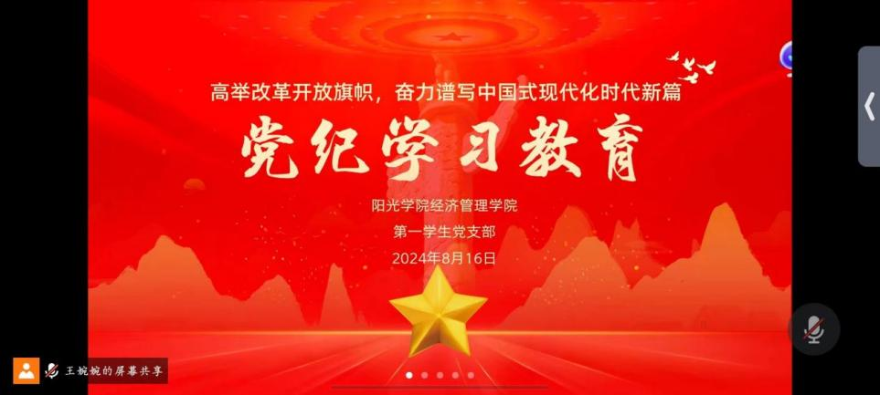 阳光学院经济管理学院第一学生党支部积极响应党中央号召,将学习贯彻党的二十届三中全会精神作为当前及今后一个时期的重大政治任务,于2024年08月16日在线上平台成功开展了党纪学习活动,专题学习贯彻党的二十届三中全会精神,旨在让支部党员深刻领会全会精神及提升学生党员的政治素养和纪律意识。