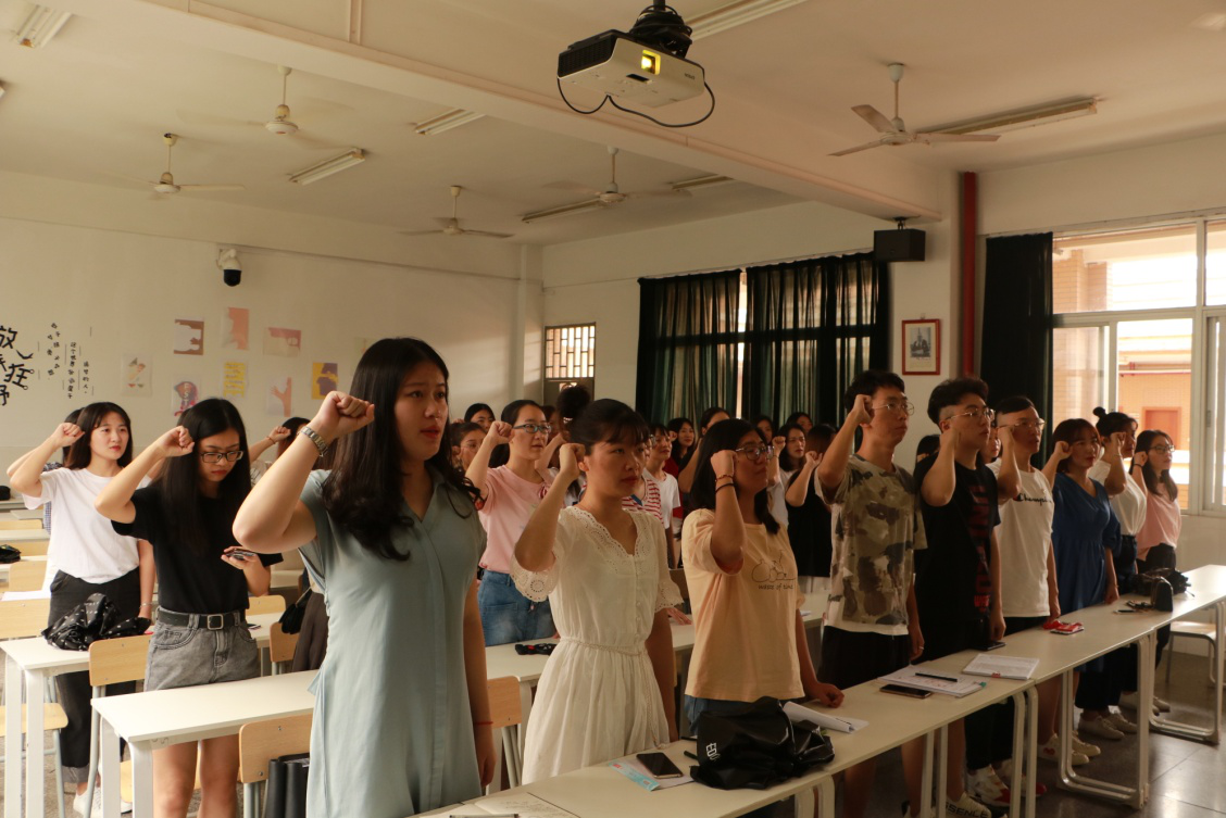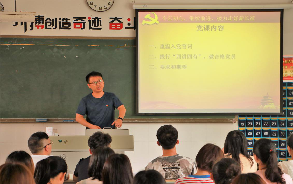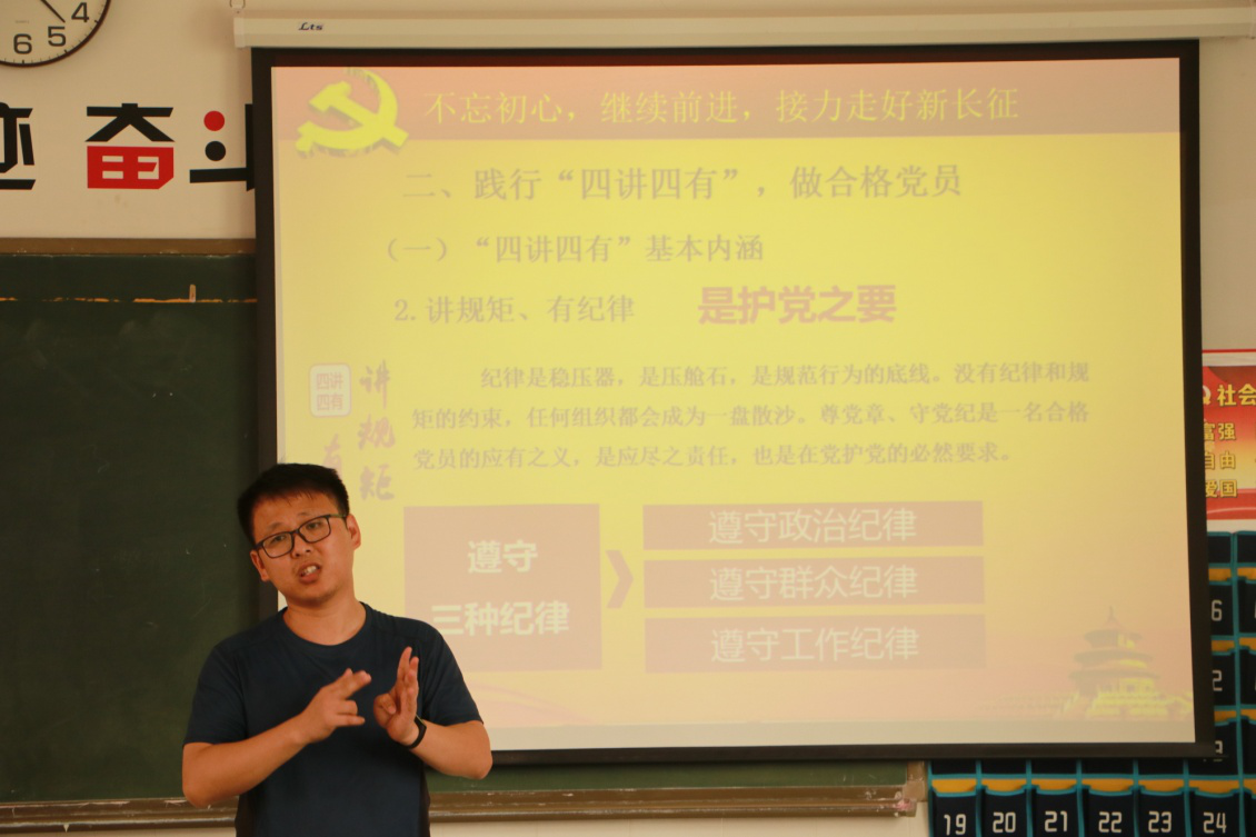 党课伊始,人文传播学院学生党员们面对鲜红的党旗,重温了入党誓词,铿锵有力的誓词表达了同学们不忘初心,牢记使命,忠诚为党,不懈奋斗的坚定誓言,展现学子们积极学习工作,再创辉煌的坚定决心。课上张斌老师主要围绕了如何践行“四讲四有”来寄托自己对毕业生党员的期望,“四讲四有”是一名合格党员的核心要素,是新时代党员党性的客观要求,希望广大同志可以在以后的时光里依旧践行党的教导,“不忘初心,牢记使命”。