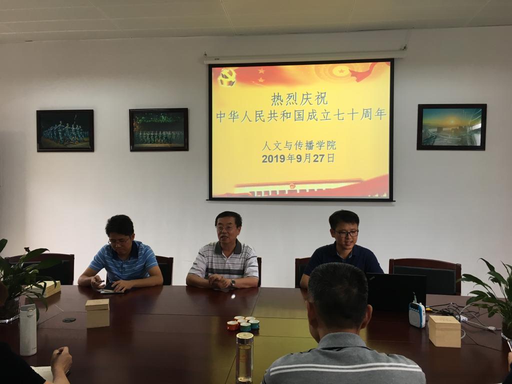 为庆祝新中国成立70周年,进一步激发广大教职工的爱国热情、民族豪情,2019年9月27日下午,人文与传播学院在文科楼501会议室举办庆祝新中国成立70周年爱国主义教育活动,全院三十多名教职工参加会议。会议由郗永勤院长主持并讲话。