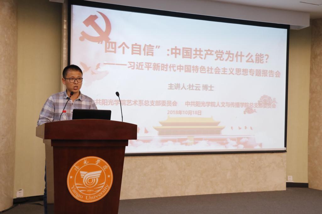 为一部贯彻落实习近平新时代中国特色社会主义思想,根据校党委红色领航工程工作部署,艺术系党总支与人文与传播学院党总支于10月18日联合举办一期习近平新时代中国特色社会主义思想红色讲坛活动,活动邀请了马克思主义学院常务副院长杜云博士为大家分享题为:“四个自信”中国共产党为什么能?专题讲座。艺术系党总支书记宋海霞老师、人文与传播学院党总支书记张斌老师出席此次活动,参加此次活动还有人文与传播学院与艺术系全体党员、入党发展对象、入党积极分子。
