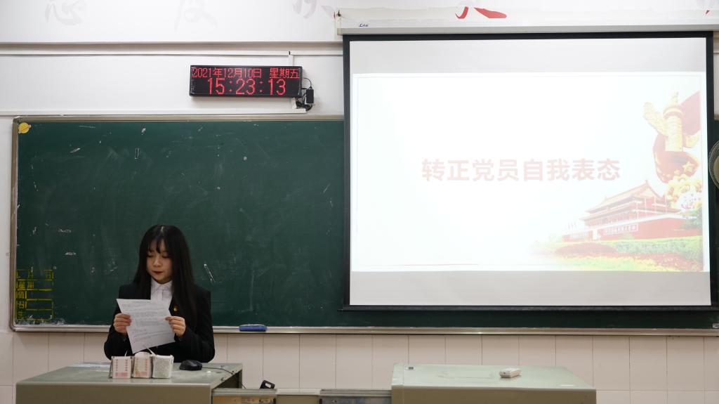 此次转正大会分为预备党员宣读转正申请、与会党员给予批评和批评建议、与会党员无记名投票、转正党员自我表态四项议程,分别讨论第一学生党支部和第二学生党支部共11名预备党员同志的转正申请。预备党员在汇报时,介绍了自己的个人情况,入党动机以及思想动态,同时辩证地分析了自身所存在的优缺点,并且郑重地承诺了成为一名中共党员之后的行为准则。