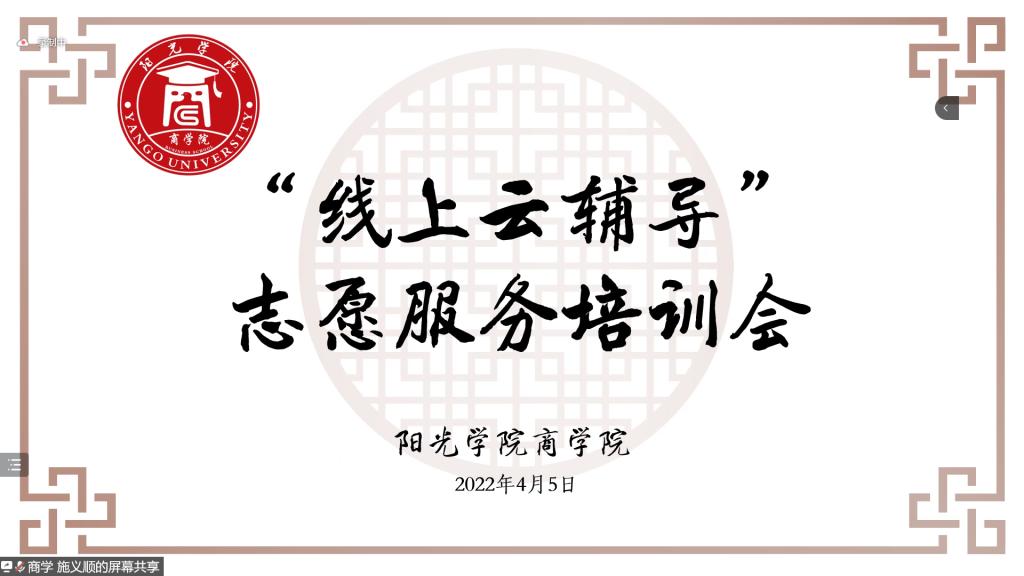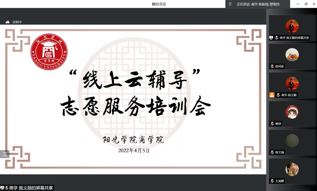 4月5日上午,商学院于腾讯会议召开“线上云辅导”志愿服务培训会。马尾团区委社工陈文强老师、马尾团区委社工林丹老师、商学院团委书记陈振伟老师、商学院团委副书记王笑老师出席了本次会议。