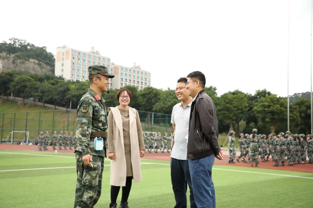 田径场上,张院长与总教官亲切交流,对军训过程中教官的严格训练、带训辅导员的辛勤付出和同学们的刻苦训练表示充分肯定和高度赞扬。他希望各位同学圆满完成各项训练任务,并将军训中收获的体会和精神带入到接下来的大学学习生活中,积极进取、奋勇争先,成为有理想、有担当、有品质、有修养、有追求和有作为的新一代的“六有青年”,让大学的四年青春更加绚丽多彩。
