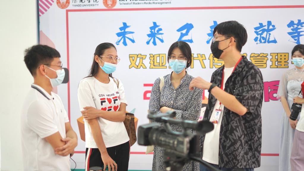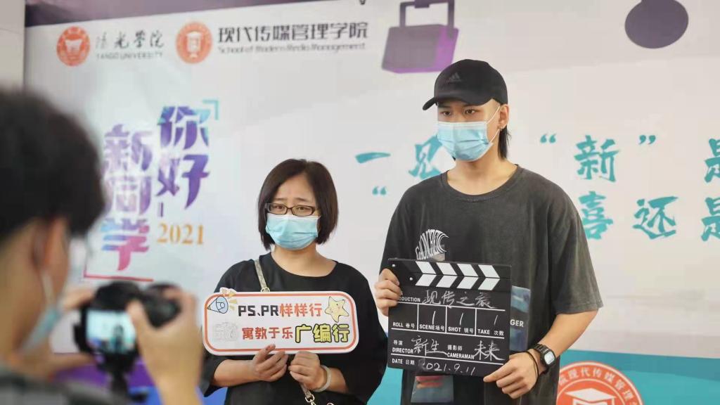 在迎新招待点,我院发挥广编专业优势,独创开设现场直播间,用专业的设备进行现场直播。将现代传媒管理学院内极具代表性专业展现得淋漓尽致,受到新生们的瞩目。