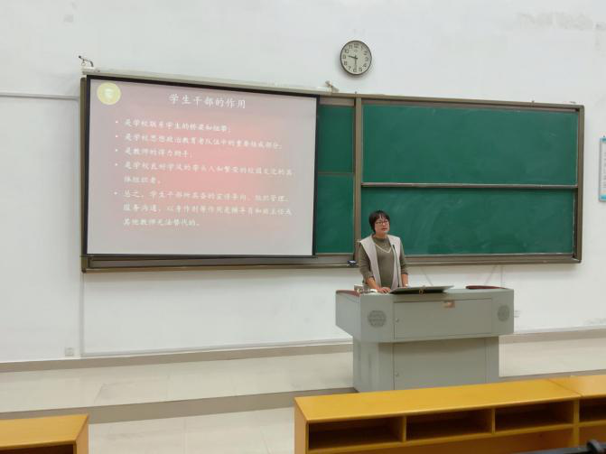 任老师从学生干部的作用、当前存在的主要问题、干部应具备的素质、怎样当好学生干部等四个方面对学生干部进行培训和指导,并对学生干部提出工作要求及改进意见。最后任老师对干部培训会进行总结,针对各部门学生干部提出个性化改进意见。