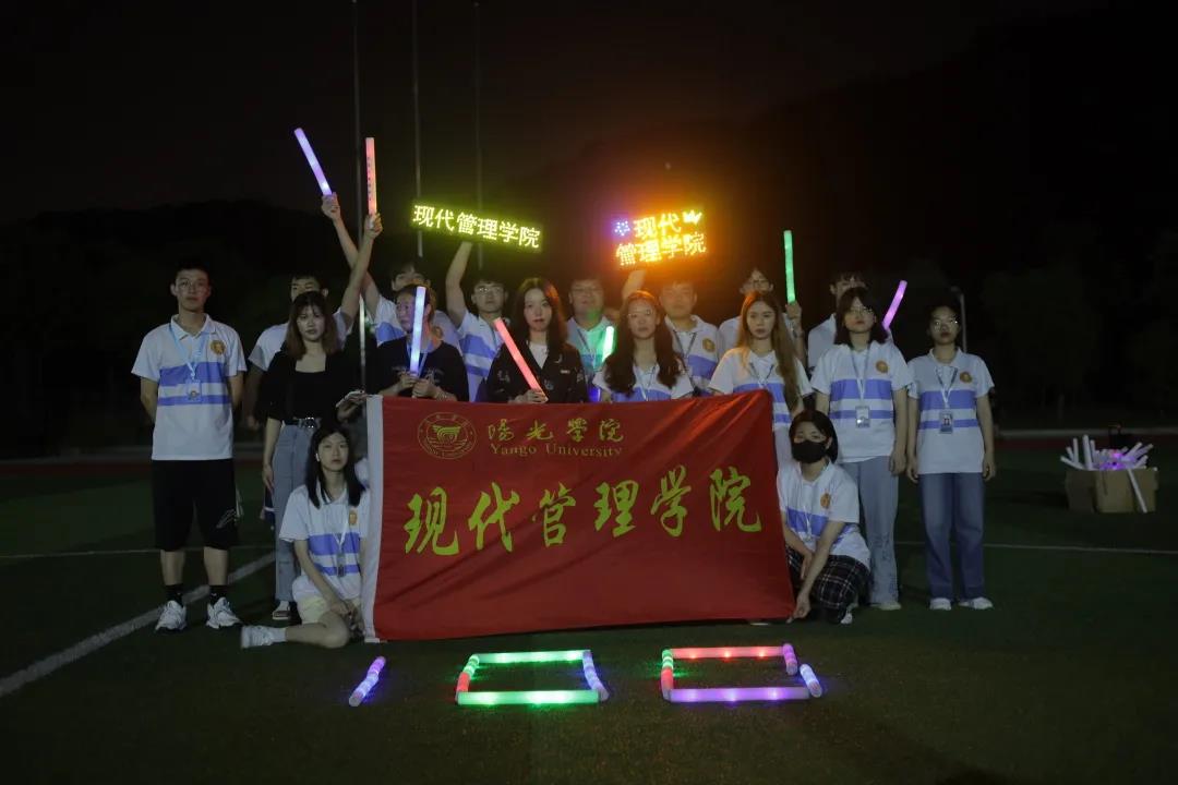 同学们身穿院服,手中挥舞着荧光棒,口中喊着“竞速时代,现管最帅,团结友爱,不可阻碍”激昂口号。虽然融于黑夜,但手中的荧光,照亮了阳光的天空,点燃了大家激进的步伐。看着这些些许稚气却无比坚毅的青春脸庞,看着在黑暗中熠熠生辉的荧光,我们仿佛透过时代,看到了当年五四的火光。