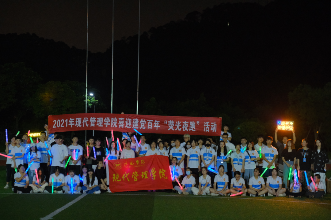 2021年6月10日晚,为庆祝中国共产党成立100周年,弘扬爱国精神,传承青春力量,现代管理学院在东区大操场举行以“百年风华正茂,书写正阳光”为主题的建党百年“荧光夜跑”活动。