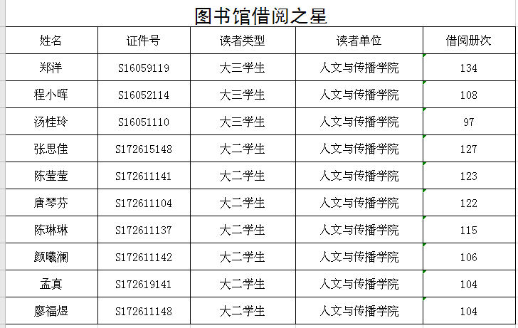 11月12日阳光学院“阅读之星”评选活动结束,根据阳光学院所有学生借阅量统计,图书馆和学工处联合表彰我院2016级郑洋和2017级学生张思佳等十名同学为“阅读之星”。行政管理专业以总借阅量达到5762本获评“校园书香专业”。