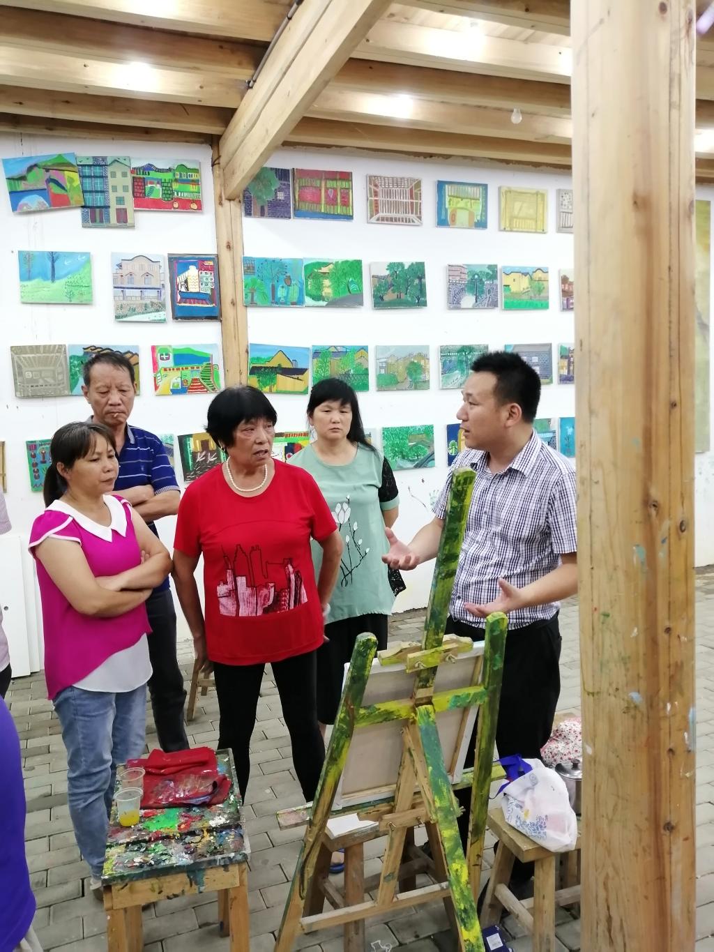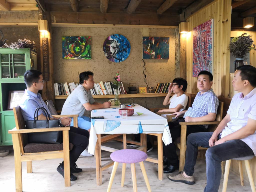 老师们与龙潭村党支部书记、村委会主任陈孝镇,龙潭村片区乡村振兴总设计师林正禄老师就乡村文化旅游产业发展进行深入的座谈交流。龙潭村通过实施“人人都是艺术家”艺术公益教学活动,让村民在文创产业链的各个环节都起到重要作用,村民成为文创生力军,创造了更多的财富。