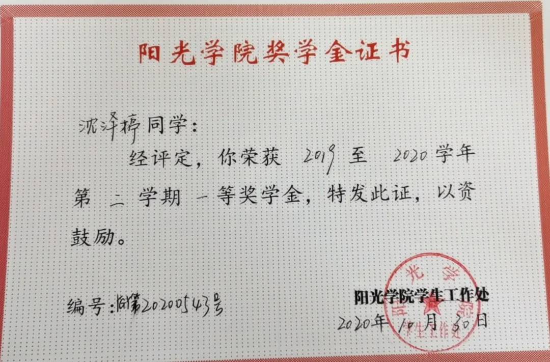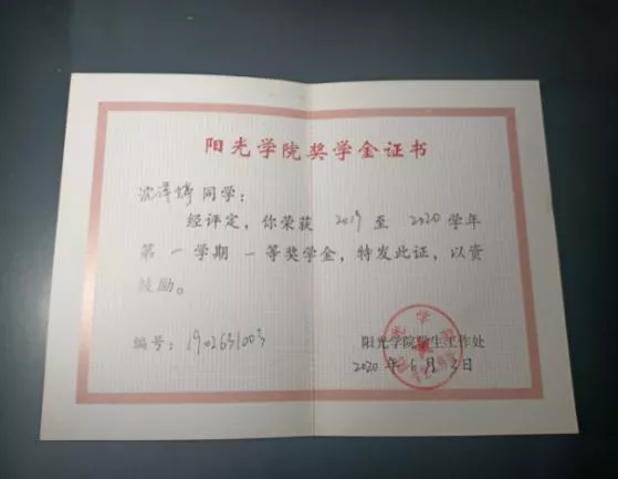 2019–2020学年第二学期获得校“一等奖学金”。