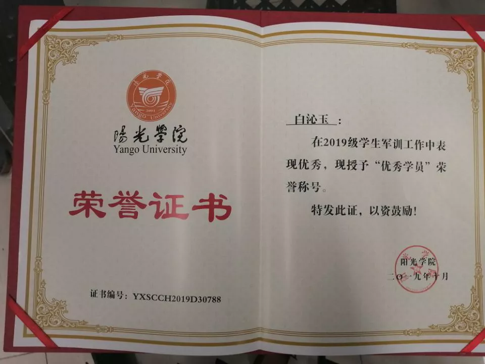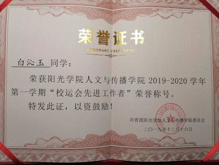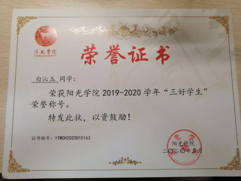 2019-2020学年阳光学院“三好学生”荣誉称号;