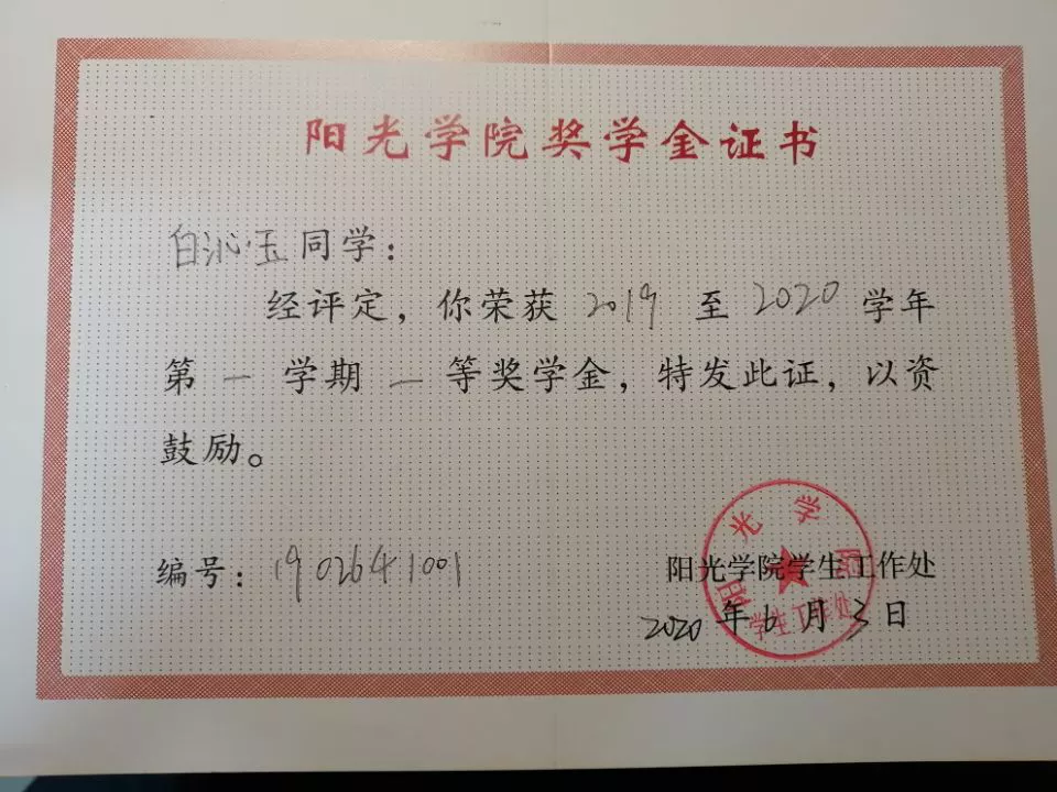 2019-2020学年第一学期阳光学院“一等奖学金;