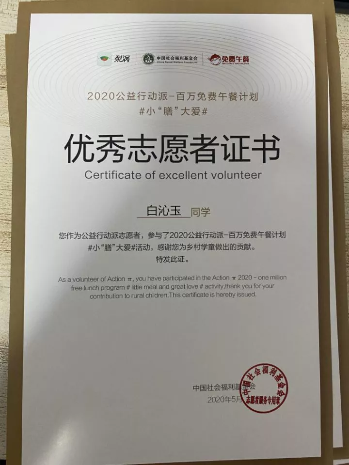 2020年八月荣获2020公益行动派-百万午餐计划#小“膳”大爱#优秀志愿者。