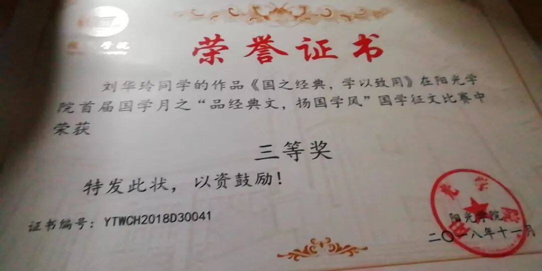 2018年11月荣获阳光学院首届国学月之“品经典文,扬国学风”国学征文比赛三等奖 ;