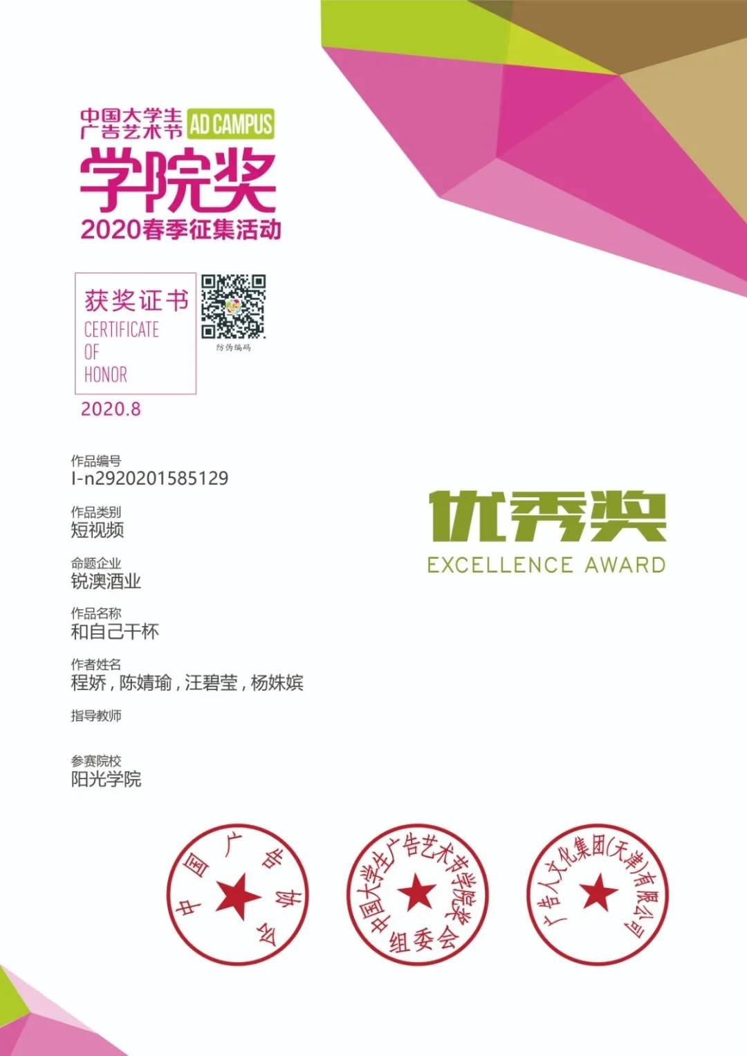 2020年获得中国大学生广告艺术节2020学院奖春季征集活动优秀奖;