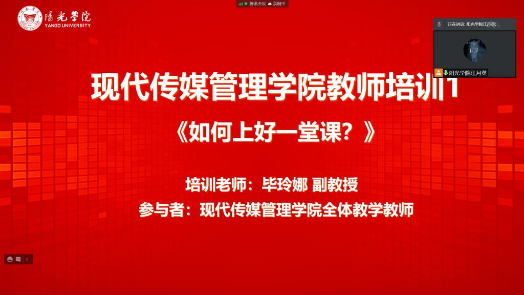 为了提升教师的课堂管理能力,学习关键教学技巧,促进新老教师的互学互助,帮助新教师尽快站稳讲台,现代传媒管理学院按照教师系列培训计划安排,于2021年9月17日在腾讯线上会议开展了“如何上好一堂课”专题讲座,邀请了商学院毕玲娜副教授主讲。本次讲座由副院长江月英副教授主持,学院全体专业教师、外聘教师参加。