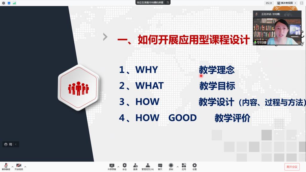 毕老师首先从教学理念、教学目标、教学设计、教学评价四个方面对当下本科应用型课程设计做了精准、凝练的总结。随后对“如何生动地上好一堂课?”这一问题进行了深入刨析,强调授课时将抽象理论具象化,重视课堂互动、激发学生学习兴趣、吸引学生关注课堂,才能保证课堂教学的质量工程能够有效推进。