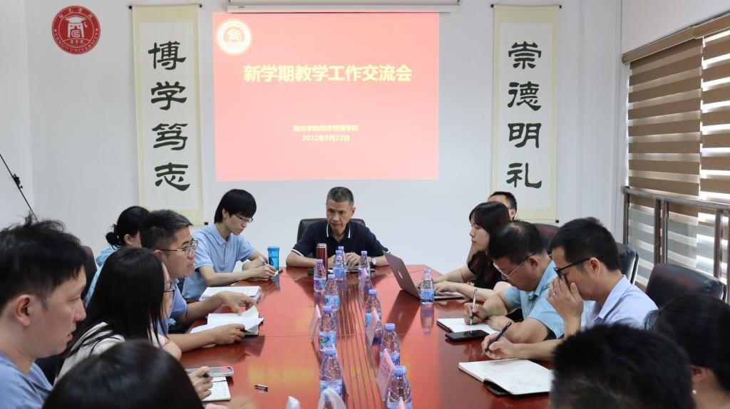 9月22日下午,经济管理学院于商学楼619召开新学期教学工作交流会,阳光学院分管教学校领导、教务处常务副处长兰石财老师、教务处副处长陈博文老师、经济管理学院院长张其春教授、经济管理学院院长助理郁榕睿副教授、傅慧静老师以及经济管理学院各系主任出席本次会议。