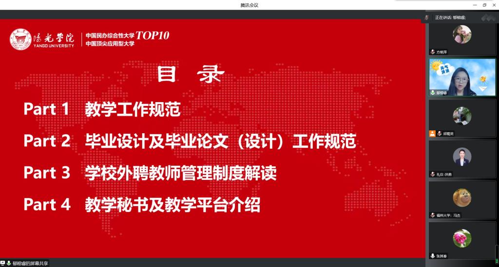 随后,院长助理郁榕睿老师对外聘教师工作进行讲解,通过教学工作规范、毕业设计及毕业论文(设计)工作规范、学校外聘教师管理制度解读、教学秘书及教学平台介绍四个部分进行总结分析,为外聘教师下一阶段的工作开展作出了重要的指导规范。