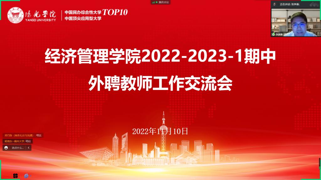 11月10日,为全面规范经济管理学院教学工作秩序,确保教育教学工作的有序开展。我院以线上形式召开期中外聘教师工作交流会,其中,经济管理学院院长张其春教授、院长助理郁榕睿副教授、教学秘书及全体外聘教师参加本次会议。
