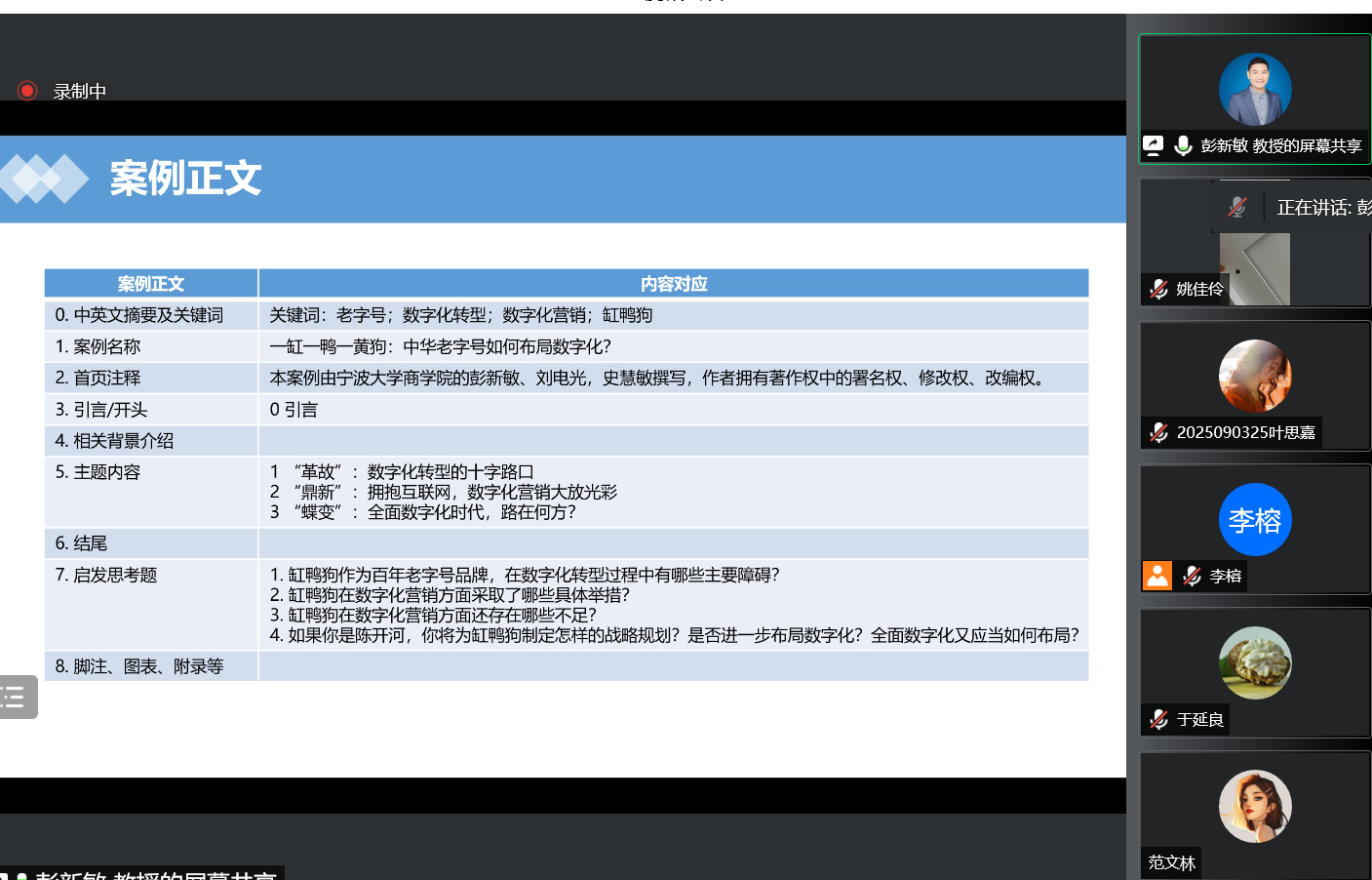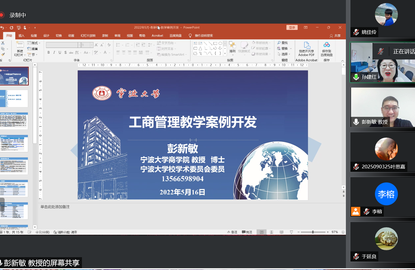 为进一步认识教育理念,促进教师专业发展,经济管理学院于2022年5月19日晚邀请宁波大学商学院教授彭新敏博士作为主讲人,由经济管理学院副院长孙建红教授主持开展工商管理教学案例开发线上讲座,经济管理学院领导班子参与本次讲座。