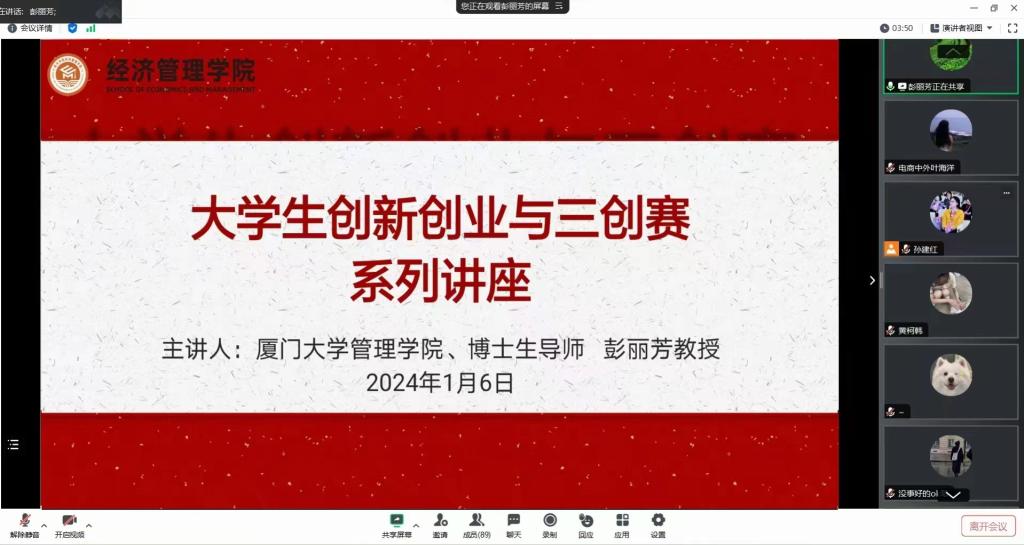 为进一步加强面向市场、面向就业的应用型、复合型人才培养体系,将学生的专业所学与市场应用充分结合起来,通过以赛促学、以学促赛,提升学生准确把握、研判、适应市场的素质和能力。2024年1月6日晚,经济管理学院举办“电子商务‘三创赛’”备赛线上讲座,特邀厦门大学管理学院彭丽芳教授对本次三创赛进行讲解。讲座由经济管理学院副院长孙建红老师主持。
