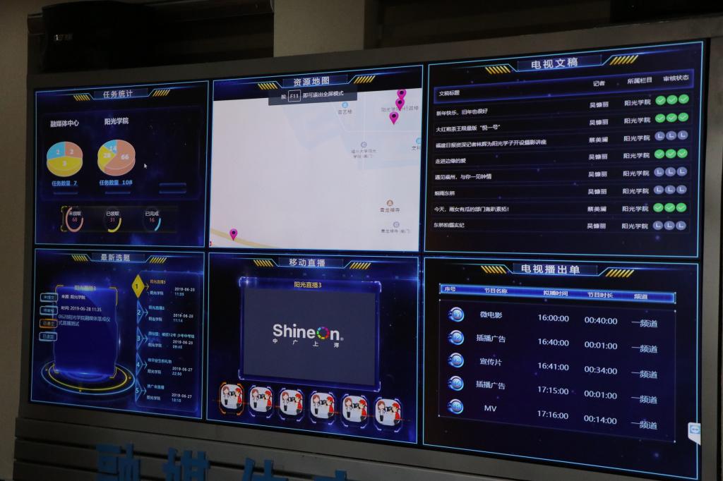 由阳光学院与中广上洋科技有限公司、福州朗星科技有限公司联合创办,旨在融媒体教学和教材研发上提供技术支撑,为中国融媒体事业发展做出贡献。阳光融媒是一套可实现全媒体、全覆盖、台网联动、交互一体的融合媒体系统。该系统具有用户直播、实时定位、资源共享、指挥大屏等特色功能。阳光学院结合融媒体实验室提出:“广编是基础,融媒体是方向”的广播影视编导专业的教学思路,为社会培养能说、会拍、精编、畅游融媒体的高素质应用型人才。