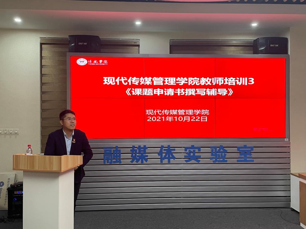 为了我院教师科研工作的顺利开展,特别是提高广大教师的课题申请书撰写能力,2021年10月22日下午,现代传媒管理学院邀请陈磊副教授举办了《课题申请书撰写辅导》专题培训。学院全体教职工参加培训,培训由张其春院长主持。