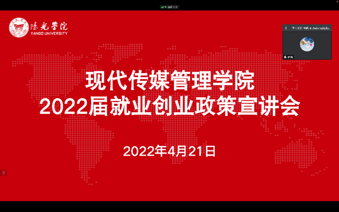 当前就业形势严峻,为培养学生正确的就业观念、加强毕业生的就业意识,更加顺利做好毕业生的就业工作。学校通过线上会议召开2022届毕业生就业创业政策宣讲会,会议由现代传媒管理学院辅导员林涵和陈瑞锋老师主持,邀请了2022届毕业生参加此次的宣讲动员会。