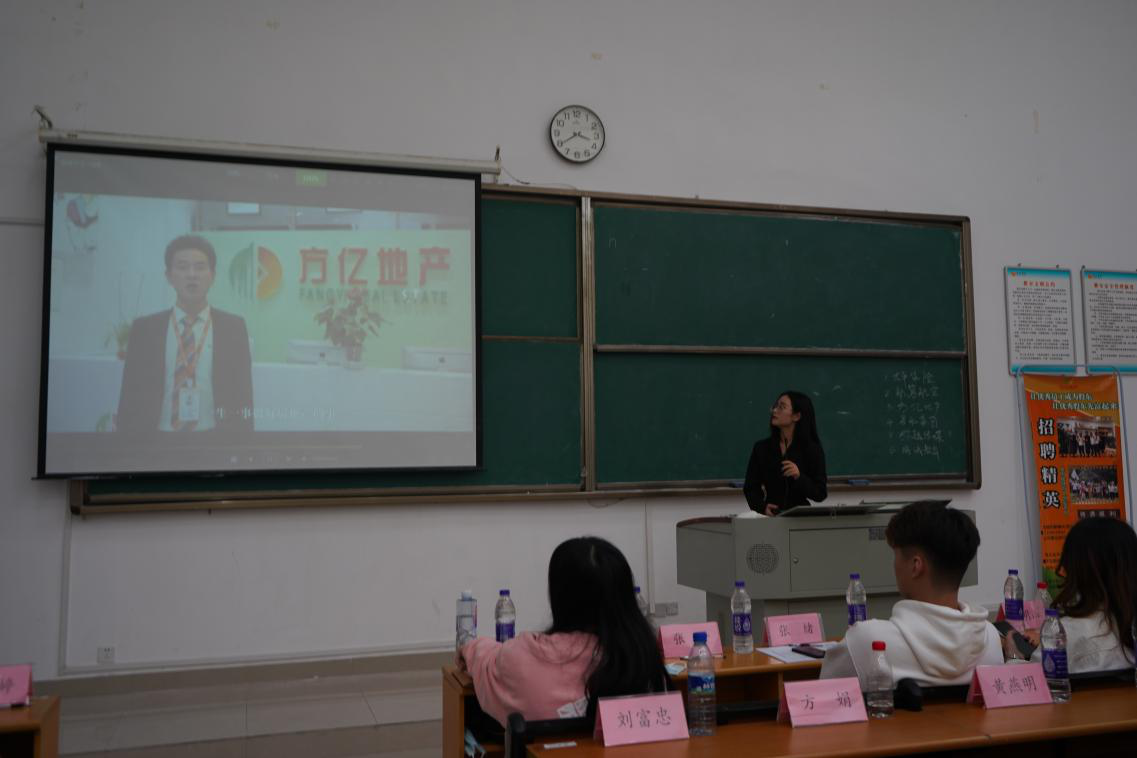 出席本次招聘会的是来自方亿房地产集团的张瑶光、王滢冰以及阮雨婷女士。首先,张瑶光女士介绍了方亿集团的核心理念“履方致远,筑梦同行”,公司为员工提供良好的福利待遇与广阔发展空间,期待更多的优秀人才能够加入集团共同发展。并指出,目前方亿集团的双轨培养计划实行全系列业务培训,将助力应届毕业生步入职场,完成学生到销售精英的转变。公司会进行多维度团队组织管理能力培训与实训,让创富与创业无缝链接。