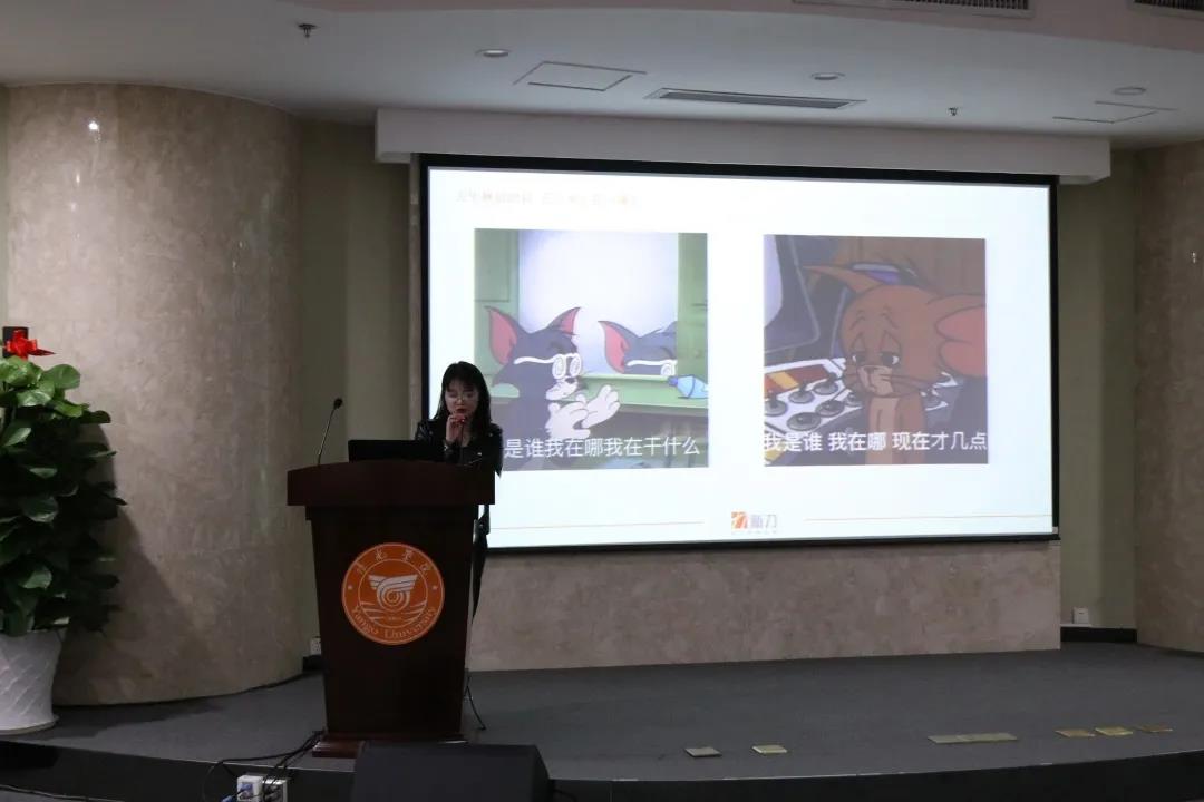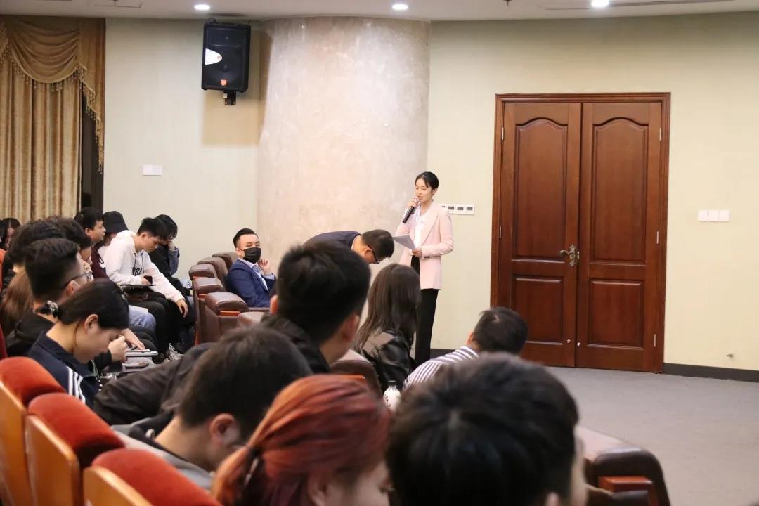 接着吴先生通过有奖知识问答发放奖品和面试pass卡,让更多在场的同学参与到游戏当中,活跃了宣讲会现场氛围。再者,新力集团2019年管培生代表珊珊上台,分享自己如何遇见并加入新力集团这个大集体,并在近两年的时间里快速地由“学生党”转为“职业营销人”的经历以及感悟。