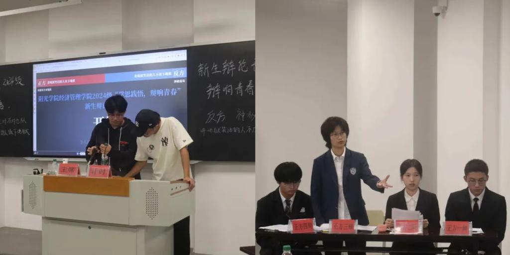 11月3号,阳光学院经济管理学院于阳光学院福州校本部和阳光学院福州滨海校区举办新生辩论赛晋级赛。在这个充满激情与挑战的时代,一场思维与口才的巅峰对决就此展开!赛场上,辩手们各抒己见,从多维度出发,提出了丰富多元的观点与见解,展现了他们广博的知识储备与敏锐的洞察能力。双方一辩犹如破晓之光,精准地锚定辩题,以清晰有力的论述拉开辩论序幕。紧接着的“攻辩”环节更是高潮迭起,辩手们彼此交锋,智慧的闪电在唇枪舌剑间频繁闪现,缜密的逻辑链条赢得了在场观众连绵不绝的热烈掌声。辩论结束后,评委们依据辩手的表现、论点清晰度、逻辑性及团队协作等多个维度进行综合考评,给出了公正无私的评分。这份评分不仅是对辩手们辛勤付出的肯定,更是对比赛公平原则的坚守。经过激烈比拼,“说的非常队”、“火箭队”、“奇迹再现队”、“我们说的都队”、“我们很强对不队”以及“对就对不对也队”凭借卓越表现,成功晋级决赛,向着最终的荣耀发起冲击。 本次“学思践悟,辩响青春”辩论赛晋级赛的辩题设计巧妙,涵盖了社会热点、哲学思考等多个领域,激发了辩手们的深入思考。在比赛中,辩手们从不同角度出发,提出了多元化的观点和见解,展现了他们丰富的知识储备和敏锐的洞察力。同时也彰显了大学文化生活的丰富内涵。